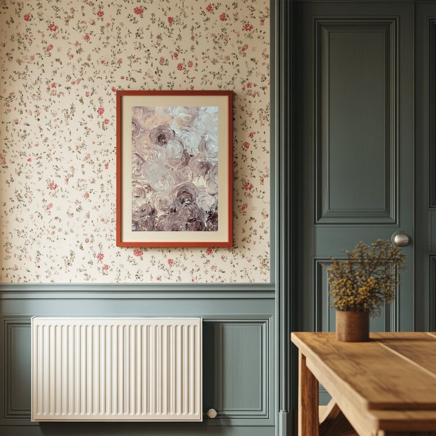 A modern approach to traditional interiors: expressive abstract art with an heirloom...