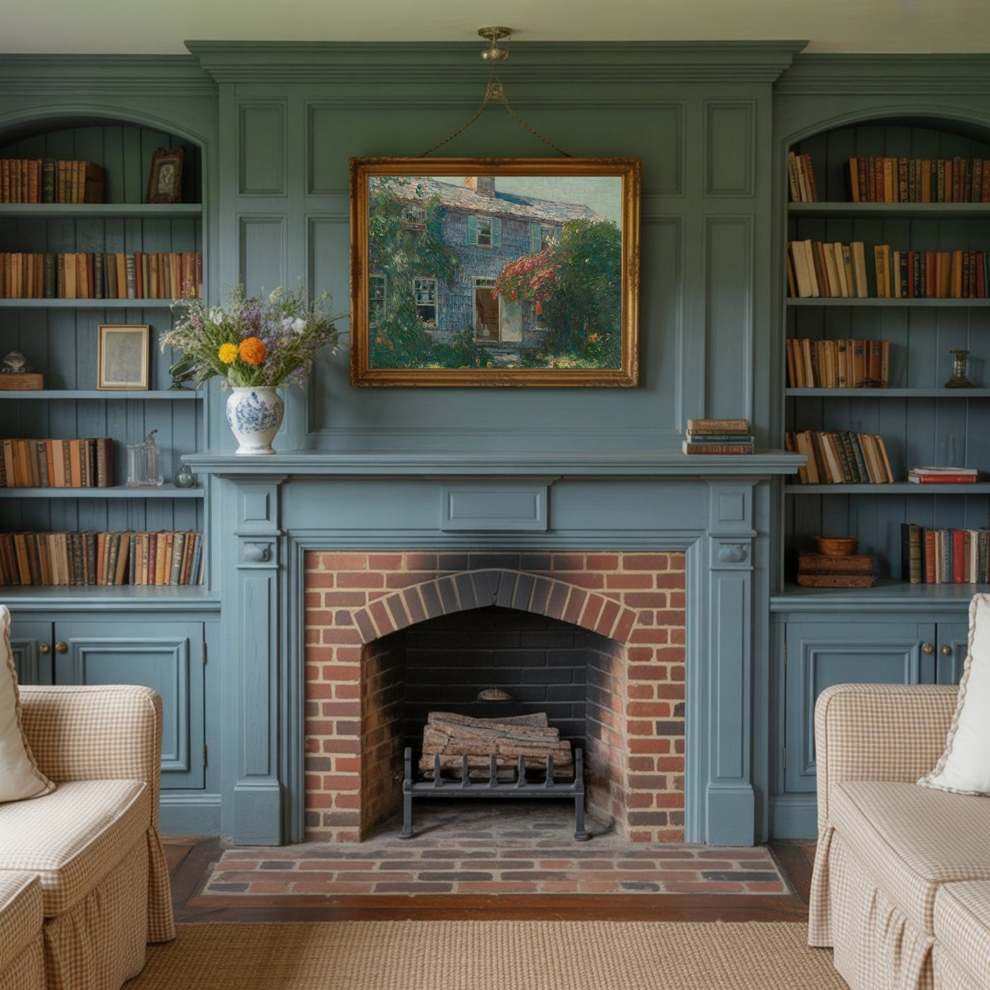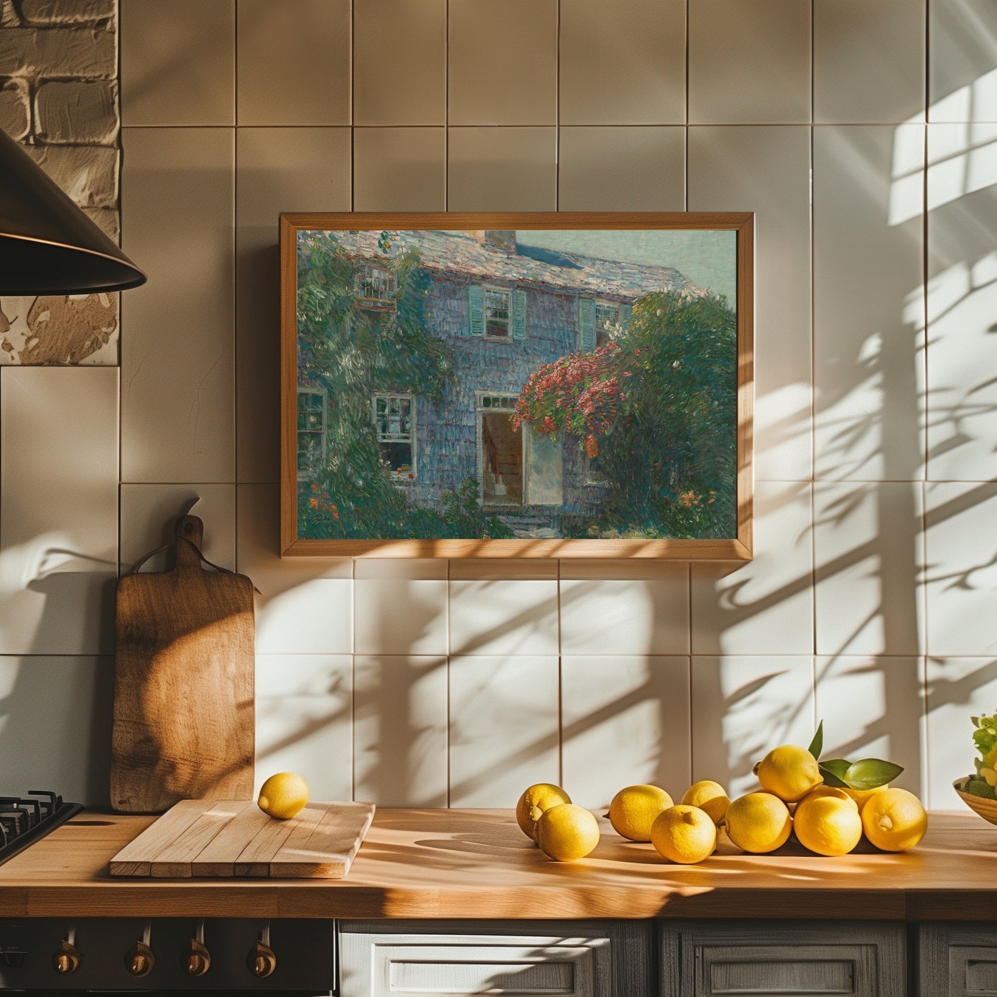 Hassam’s quintessential American scene glows with golden tones and sage greens, evoking the warmth of fall light on weathered shingles. This print adds charm and a sense of heritage to collected interiors.