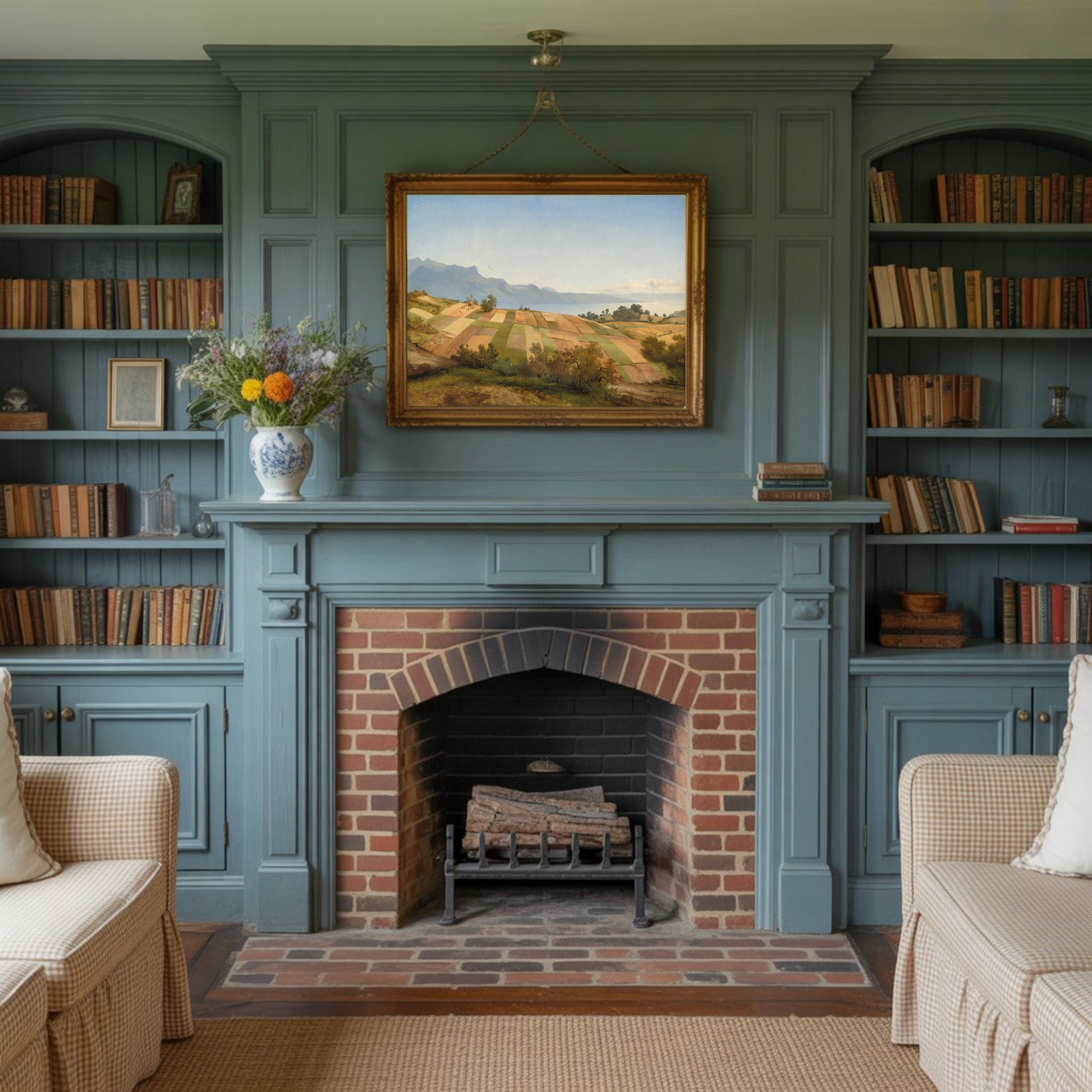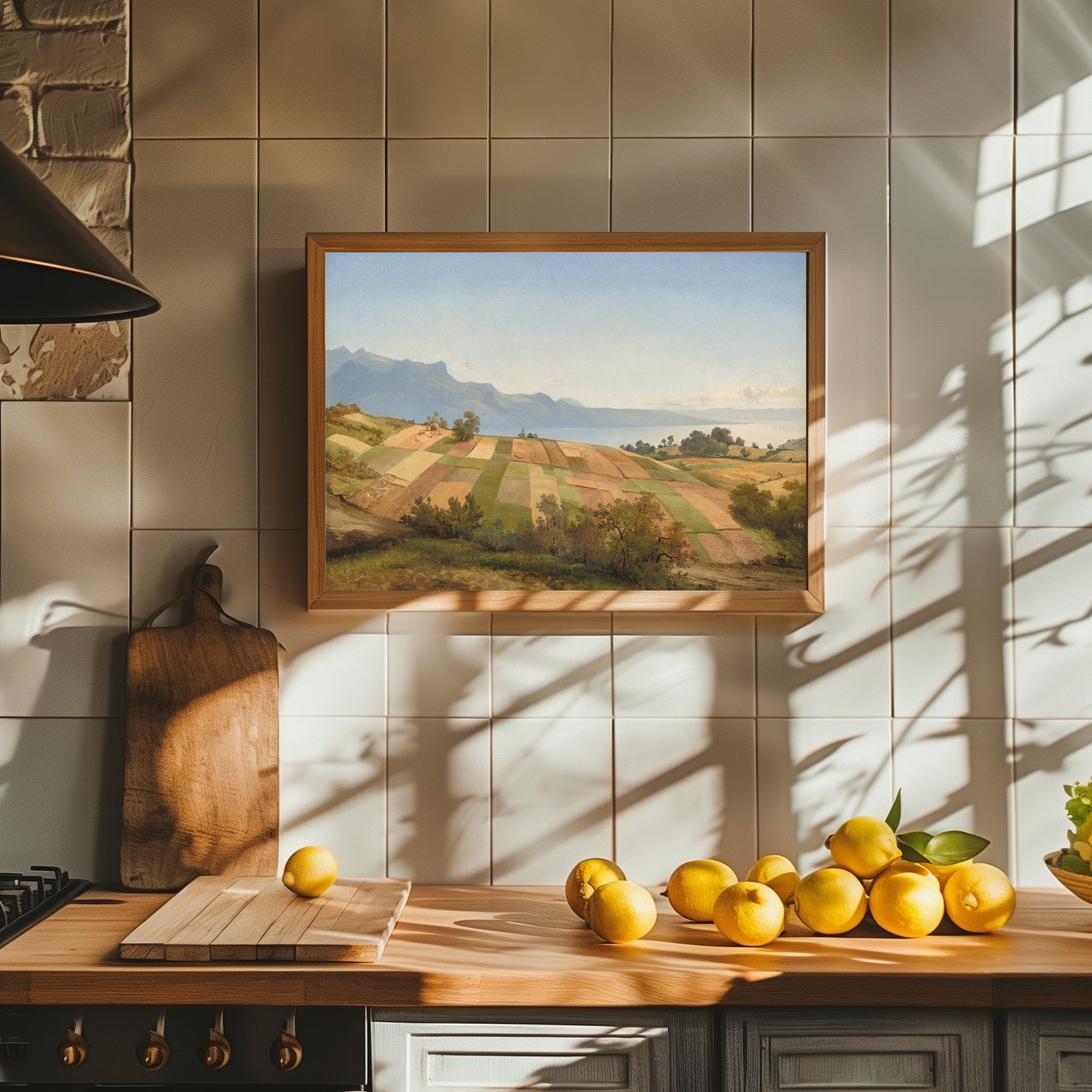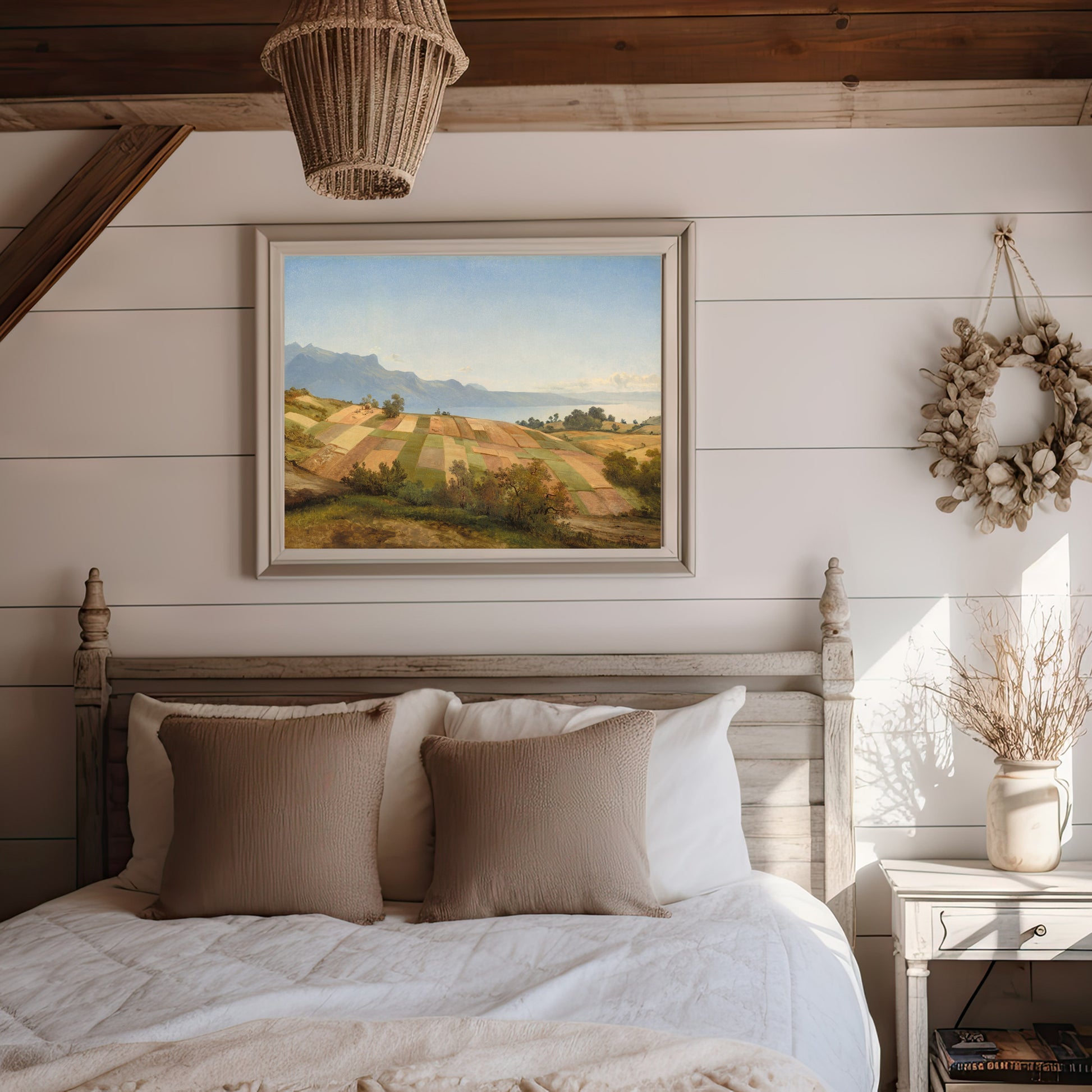 A dramatic Alpine view layered in earthy taupes and deep greens, Calame’s landscape resonates with fall’s grandeur. It pairs beautifully with modern abstracts, grounding a room in natural splendor.