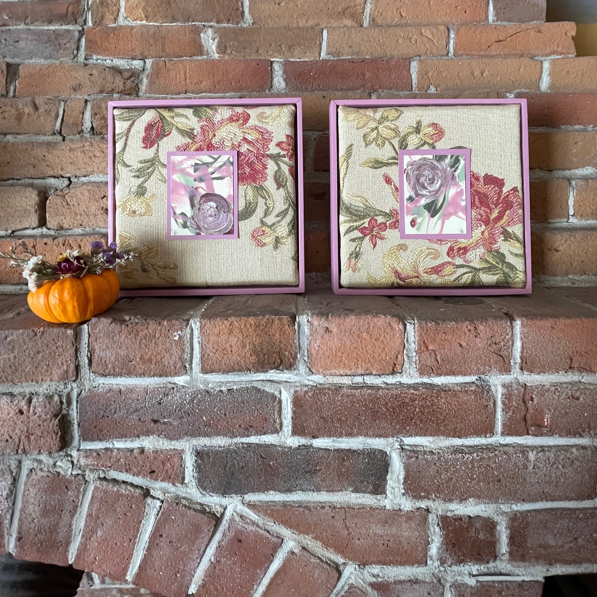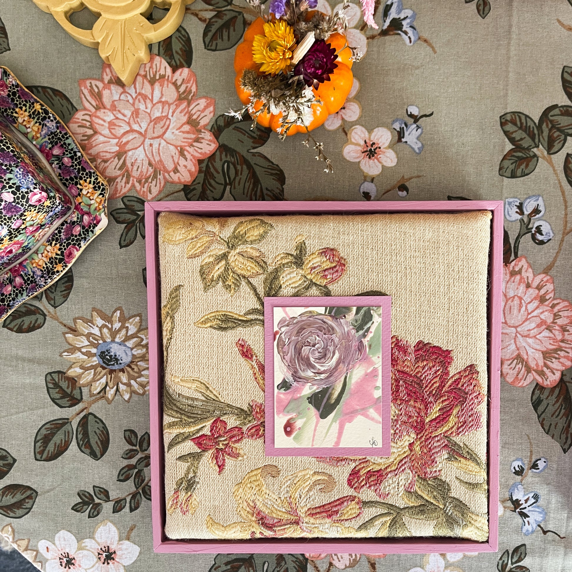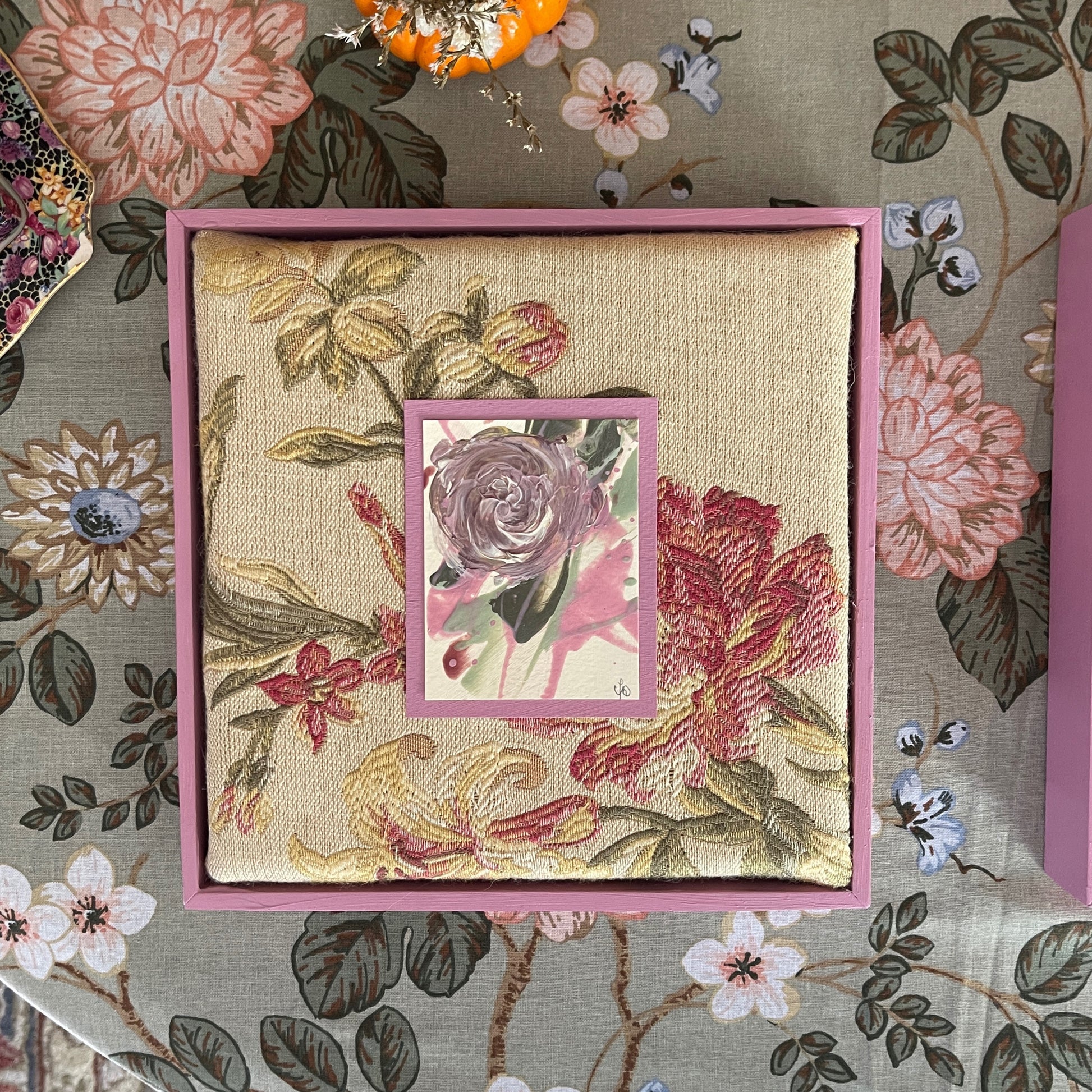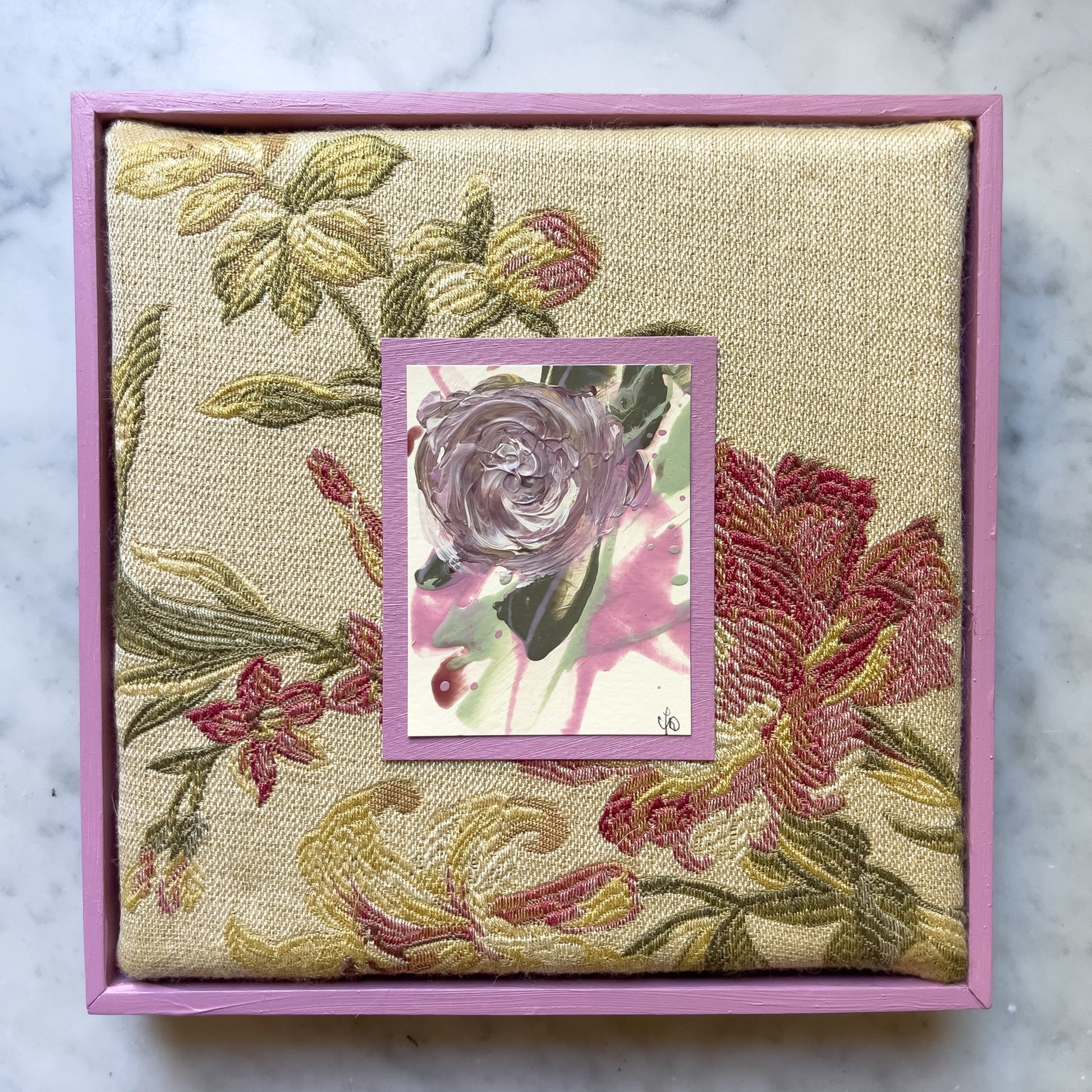 Original Artwork on Paper | Antique Brocade Fabric Mounting & Coordinating Wood Frame | 8 x 8 inches