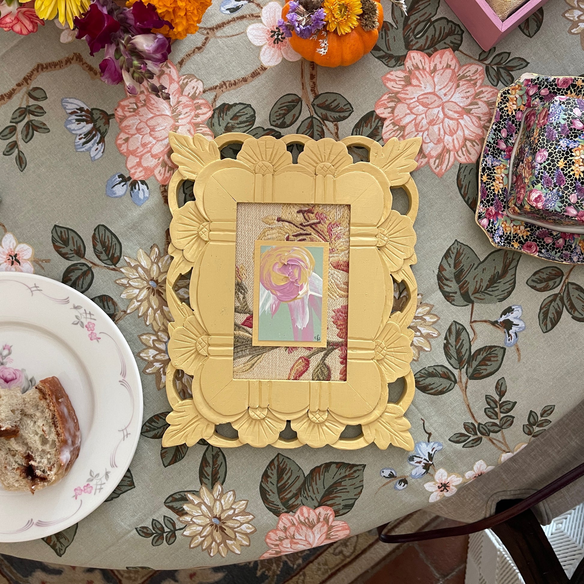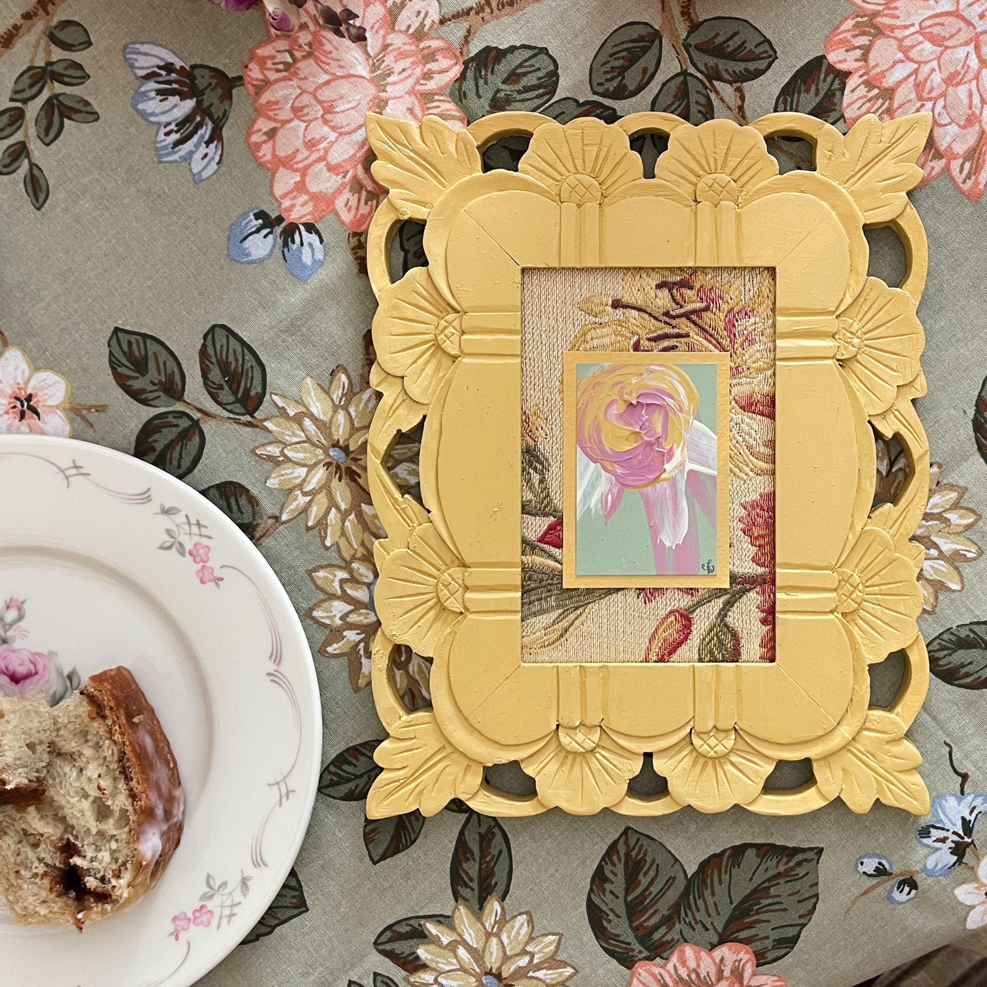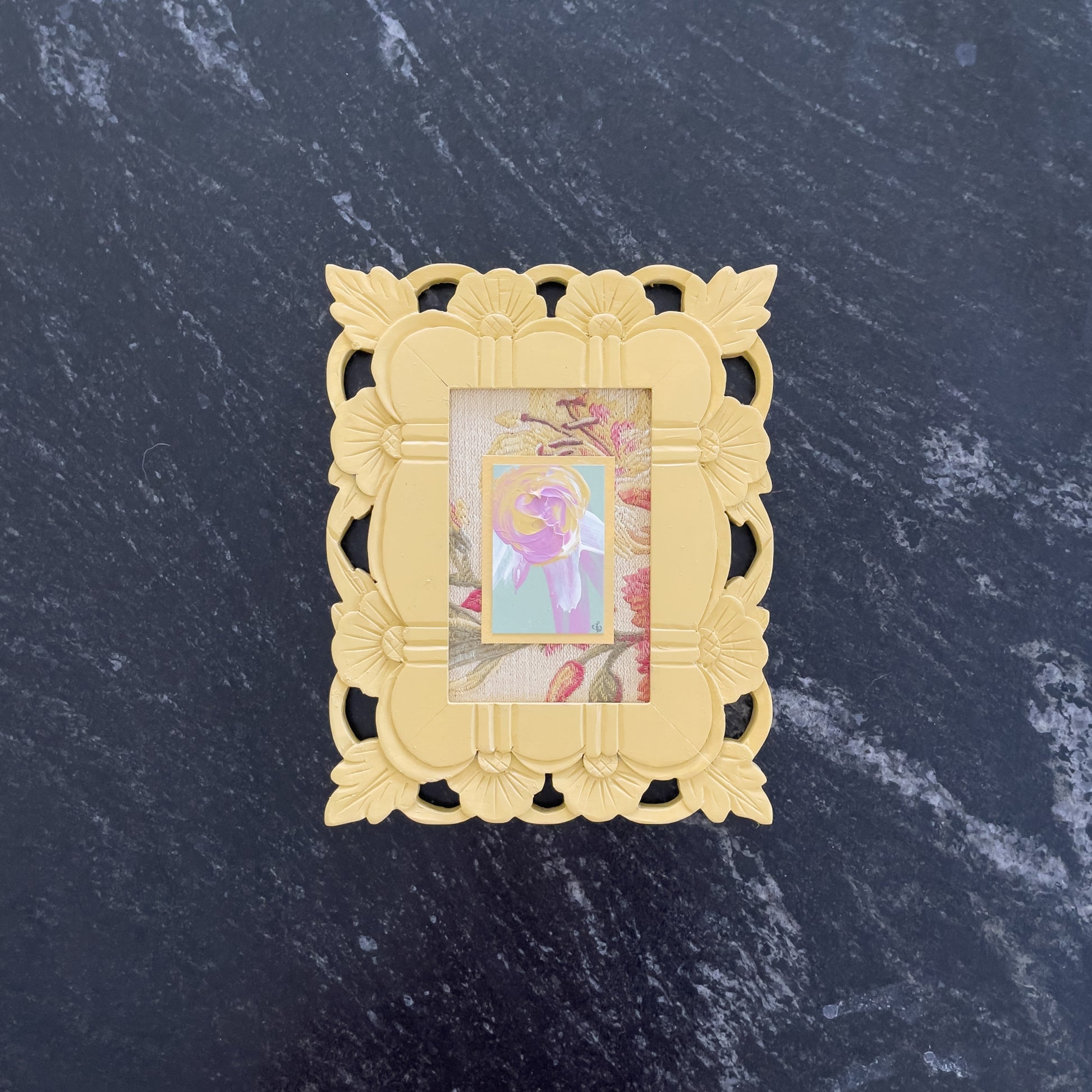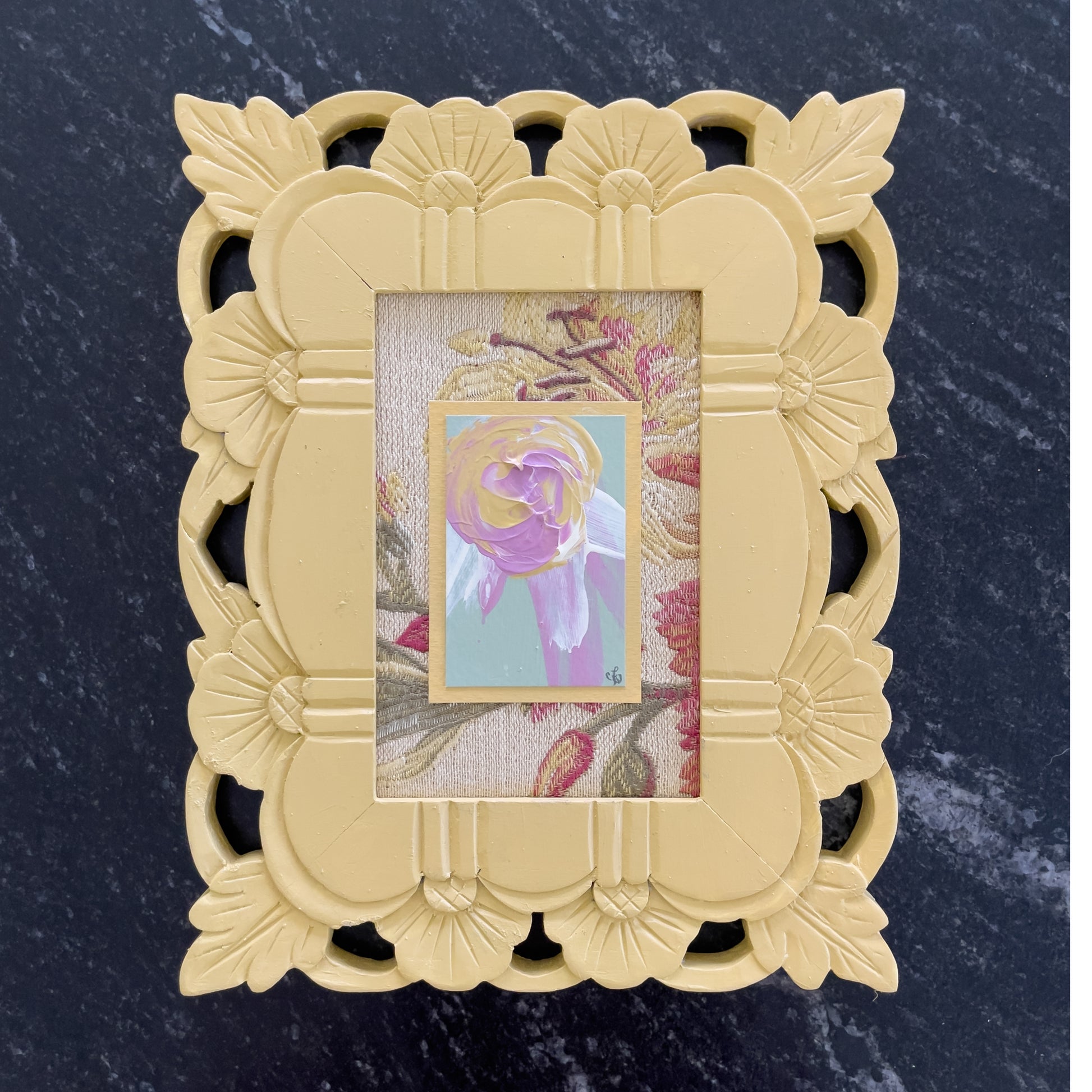 Original Artwork on Paper | Antique Brocade Fabric Mounting & Coordinating Wood Frame | 6 x 8 inches